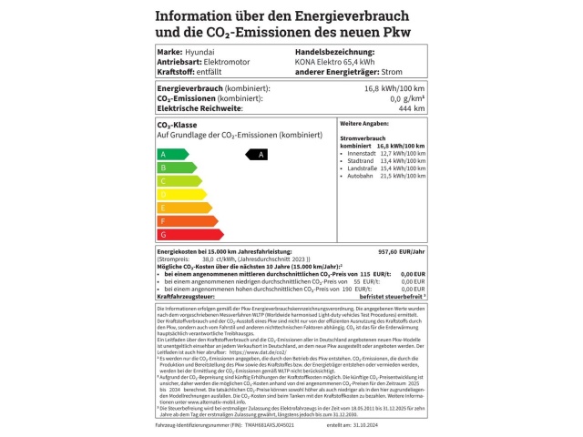 In de Duitse advertentie van deze Hyundai Kona staat een CO2-uitstoot vermeld van 0 gram per km. Op basis daarvan hebben wij geautomatiseerd een indicatief rest-BPM bedrag van € 467 berekend op basis van de afschrijvingstabel van de Belastingdienst. Een handmatige BPM berekening o.b.v. een waardebepaling leidt voor jonge auto's vaak tot een lager rest-BPM bedrag. Vraag hiertoe een offerte aan, vaak kunnen we daar een besparing voor u realiseren. Om hiervoor een fiscaal akkoord te krijgen zal de BPM aangifte worden aangevuld met een waardebepaling taxatierapport. Wij rekenen een fee voor onze bemiddeling hierin. Uiteraard alleen wanneer dit rendabel is.