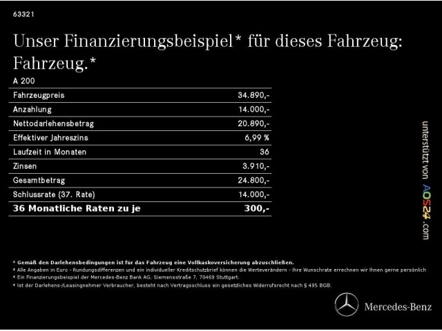 Voor zakelijke klanten bieden wij optioneel een financial lease oplossing en voor particuliere klanten een persoonlijke lening. Met onderstaande module kunt u uw maandbedrag berekenen voor het financieren van bovenstaande Mercedes-Benz A 200.