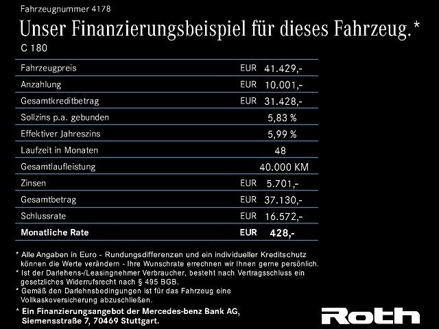 Voor zakelijke klanten bieden wij optioneel een financial lease oplossing en voor particuliere klanten een persoonlijke lening. Met onderstaande module kunt u uw maandbedrag berekenen voor het financieren van bovenstaande Mercedes-Benz C 180.