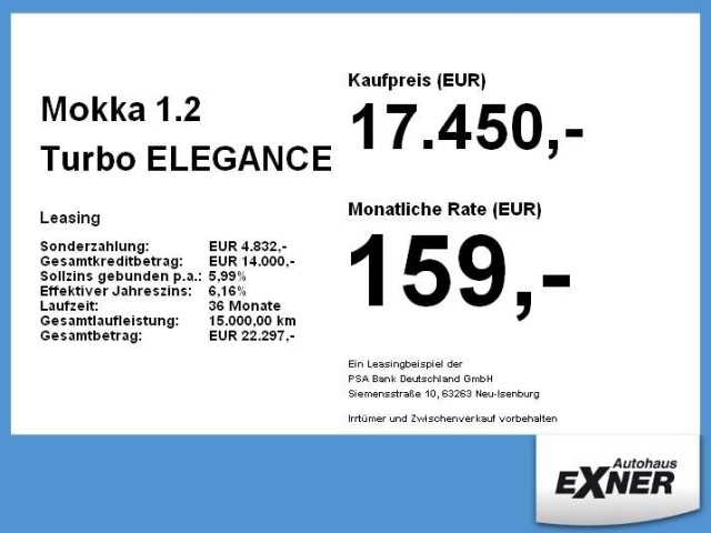 Voor zakelijke klanten bieden wij optioneel een financial lease oplossing en voor particuliere klanten een persoonlijke lening. Met onderstaande module kunt u uw maandbedrag berekenen voor het financieren van bovenstaande Opel Mokka.