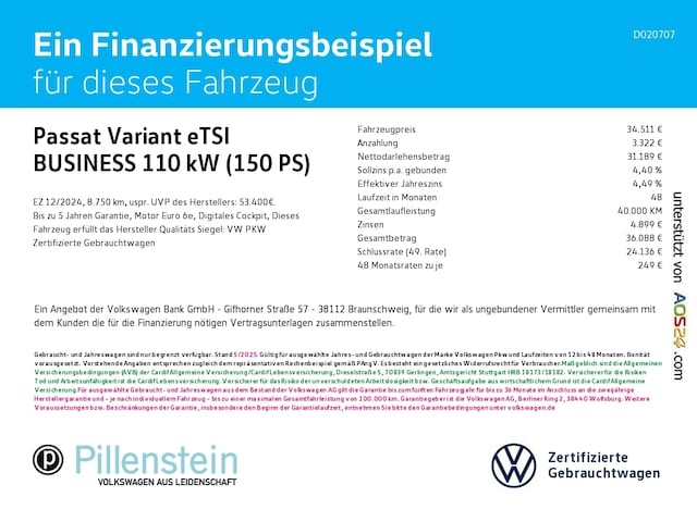 Voor zakelijke klanten bieden wij optioneel een financial lease oplossing en voor particuliere klanten een persoonlijke lening. Met onderstaande module kunt u uw maandbedrag berekenen voor het financieren van bovenstaande Volkswagen Passat.