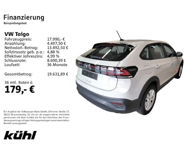 Voor zakelijke klanten bieden wij optioneel een financial lease oplossing en voor particuliere klanten een persoonlijke lening. Met onderstaande module kunt u uw maandbedrag berekenen voor het financieren van bovenstaande Volkswagen Taigo.