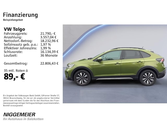 Voor zakelijke klanten bieden wij optioneel een financial lease oplossing en voor particuliere klanten een persoonlijke lening. Met onderstaande module kunt u uw maandbedrag berekenen voor het financieren van bovenstaande Volkswagen Taigo.