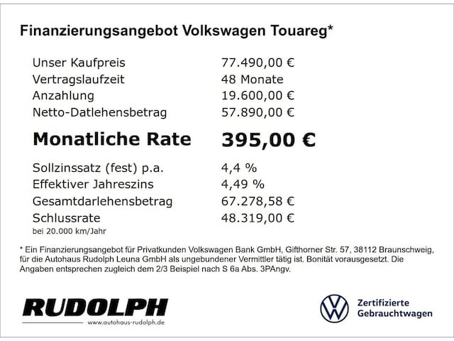 Voor zakelijke klanten bieden wij optioneel een financial lease oplossing en voor particuliere klanten een persoonlijke lening. Met onderstaande module kunt u uw maandbedrag berekenen voor het financieren van bovenstaande Volkswagen Touareg.