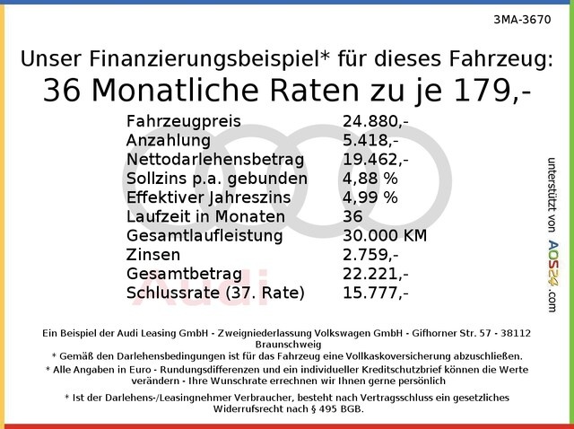 Voor zakelijke klanten bieden wij optioneel een financial lease oplossing en voor particuliere klanten een persoonlijke lening. Met onderstaande module kunt u uw maandbedrag berekenen voor het financieren van bovenstaande Audi A4.