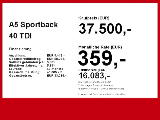 Voor zakelijke klanten bieden wij optioneel een financial lease oplossing en voor particuliere klanten een persoonlijke lening. Met onderstaande module kunt u uw maandbedrag berekenen voor het financieren van bovenstaande Audi A5.