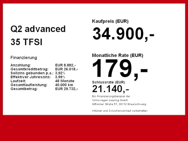 Voor zakelijke klanten bieden wij optioneel een financial lease oplossing en voor particuliere klanten een persoonlijke lening. Met onderstaande module kunt u uw maandbedrag berekenen voor het financieren van bovenstaande Audi Q2.