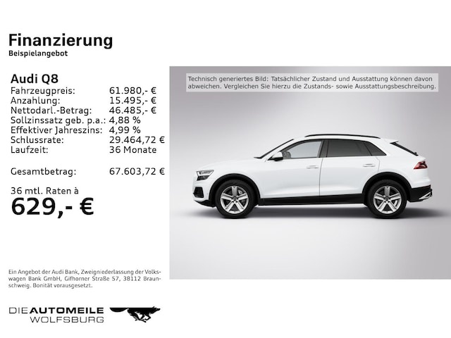 Voor zakelijke klanten bieden wij optioneel een financial lease oplossing en voor particuliere klanten een persoonlijke lening. Met onderstaande module kunt u uw maandbedrag berekenen voor het financieren van bovenstaande Audi Q8.