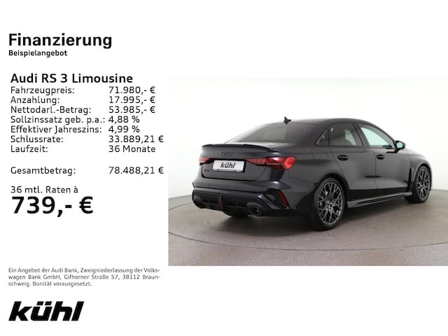 Voor zakelijke klanten bieden wij optioneel een financial lease oplossing en voor particuliere klanten een persoonlijke lening. Met onderstaande module kunt u uw maandbedrag berekenen voor het financieren van bovenstaande Audi RS3.