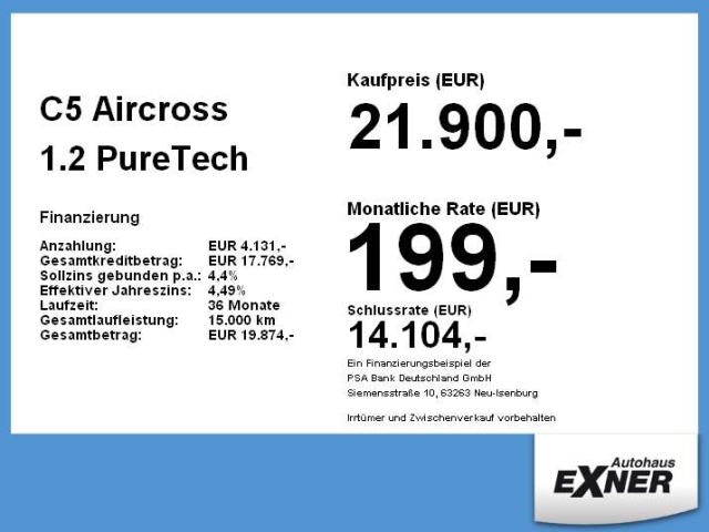 Voor zakelijke klanten bieden wij optioneel een financial lease oplossing en voor particuliere klanten een persoonlijke lening. Met onderstaande module kunt u uw maandbedrag berekenen voor het financieren van bovenstaande Citroën C5 Aircross.