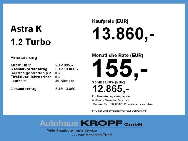 Voor zakelijke klanten bieden wij optioneel een financial lease oplossing en voor particuliere klanten een persoonlijke lening. Met onderstaande module kunt u uw maandbedrag berekenen voor het financieren van bovenstaande Opel Astra.