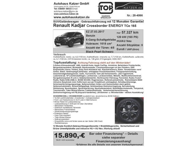 In de Duitse advertentie van deze Renault Kadjar staat een CO2-uitstoot vermeld van 139 gram per km. Op basis daarvan hebben wij geautomatiseerd een indicatief rest-BPM bedrag van € 1.612 berekend op basis van de afschrijvingstabel van de Belastingdienst. Een handmatige BPM berekening o.b.v. een waardebepaling leidt voor jonge auto's vaak tot een lager rest-BPM bedrag. Vraag hiertoe een offerte aan, vaak kunnen we daar een besparing voor u realiseren. Om hiervoor een fiscaal akkoord te krijgen zal de BPM aangifte worden aangevuld met een waardebepaling taxatierapport. Wij rekenen een fee voor onze bemiddeling hierin. Uiteraard alleen wanneer dit rendabel is.