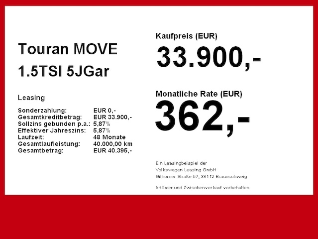Voor zakelijke klanten bieden wij optioneel een financial lease oplossing en voor particuliere klanten een persoonlijke lening. Met onderstaande module kunt u uw maandbedrag berekenen voor het financieren van bovenstaande Volkswagen Touran.